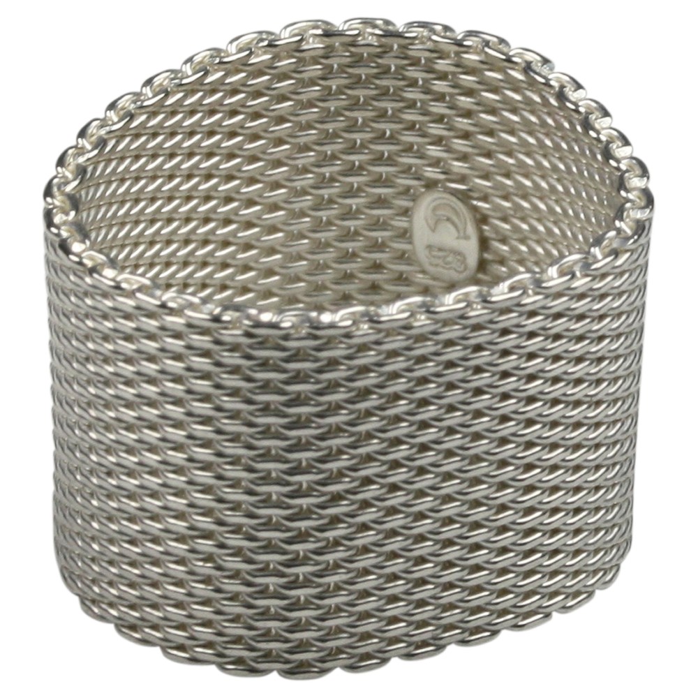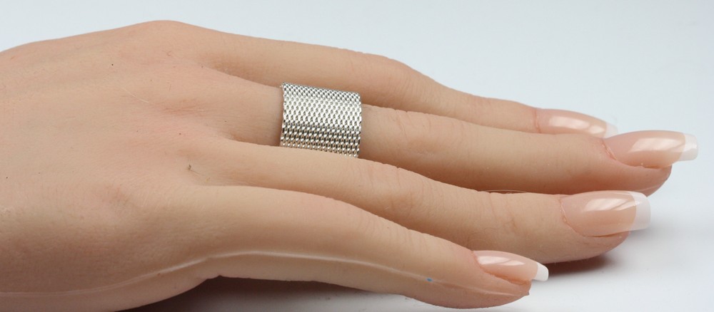 Ein ausgesprochen schöner und fein gearbeiteter Ring aus poliertem 925er Silber. Der beweglich geflochtene Ring hat eine Breite von 15mm.