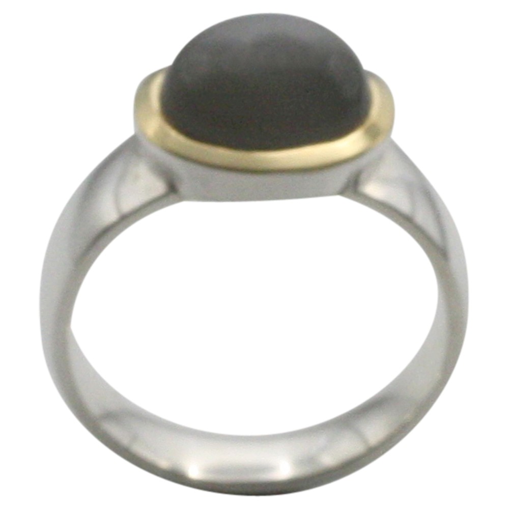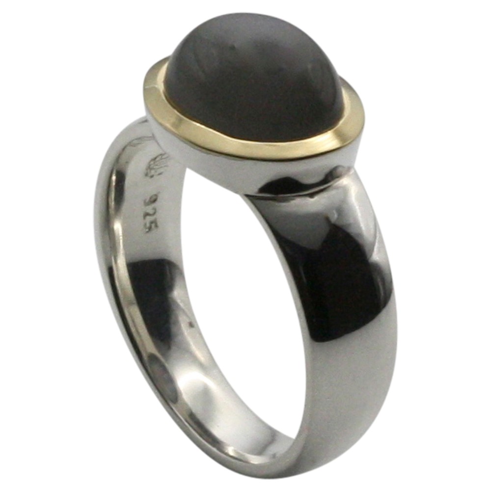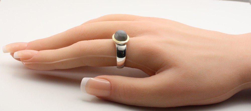 Ein bildschöner eleganter Ring aus poliertem 925er Silber, besetzt mit einem edlen grauen Mondstein. Der Fassung um den Stein herum ist hochwerting vergoldet. Der querliegende Ringkopf hat die Größe von ca. 11,5 mm x 13mm (je Ring leicht unterschiedlich). Die bombierte Ringschiene ist oben 7 mm breit und verjüngt sich nach unten auf 4 mm.