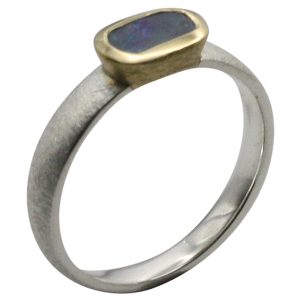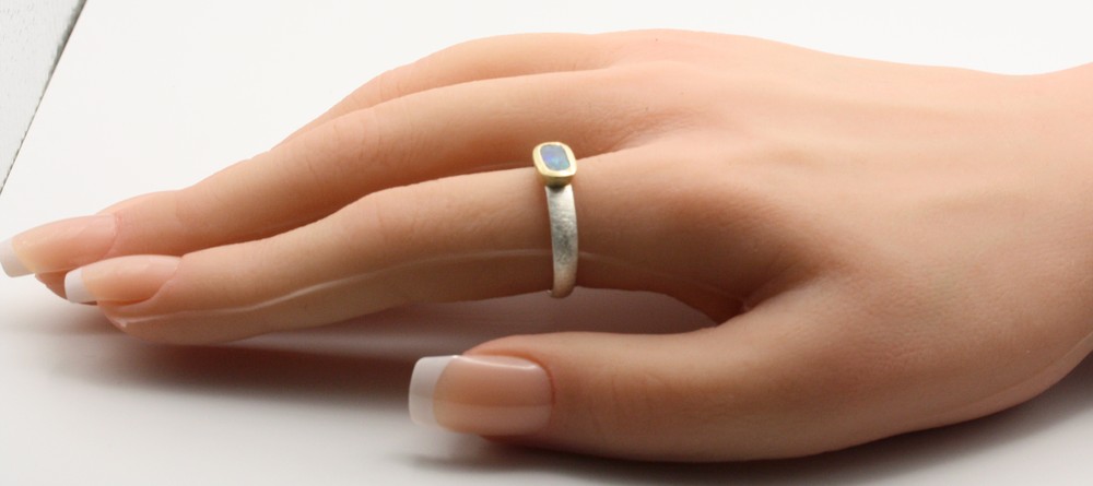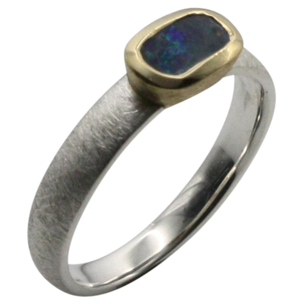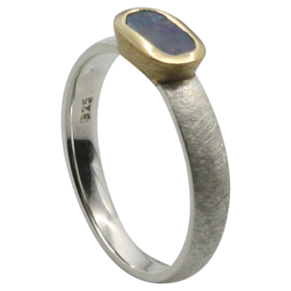 Ein besonderer und hochwertig gearbeiteter Ring aus gebürsteten 925er Silber, besetzt mit einem querliegenden australischen Boulderopal. Die bombierte Ringschiene ist oben 4 mm breit und verjüngt sich nach unten auf 3 mm. Der rechteckige vergoldete Ringkopf hat eine Breite von 9 mm und eine Länge von 6 mm.