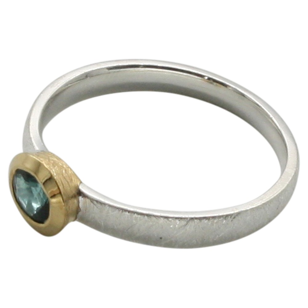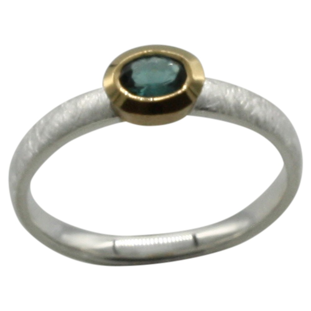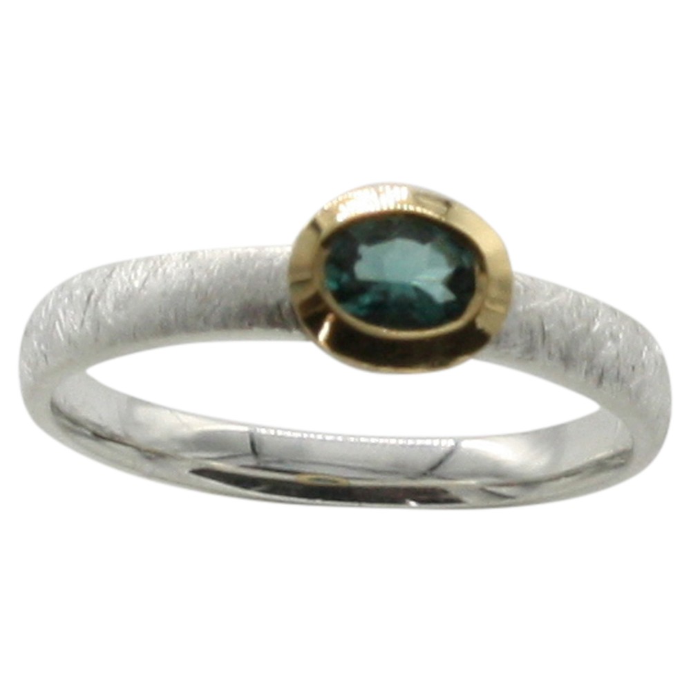 Ein feiner Ring aus gebürstetem 925er Silber, besetzt mit einem ausdrucksstarken grünen Indigolith, Der ovale und hochwertig vergoldete Ringkopf hat die Größe 6mm x 7mm. Die bombierte Ringschiene ist ober 3mm breit und verjüngt sich nach unten auf 2,3mm.
