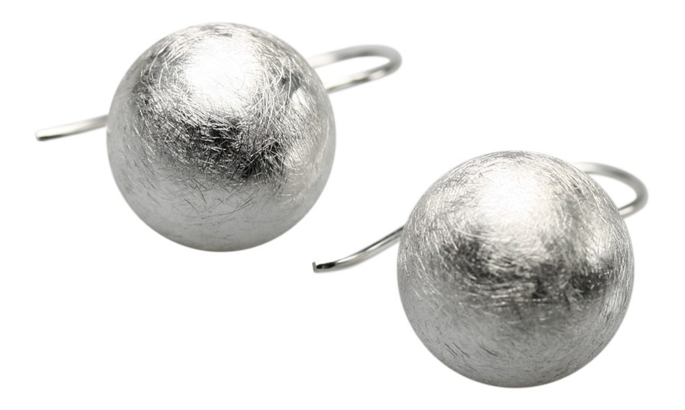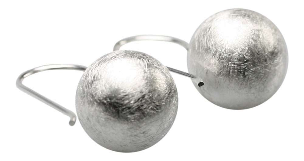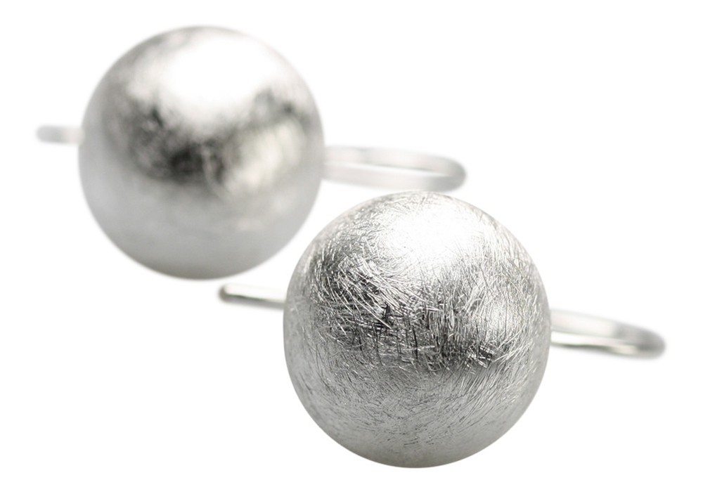 Ein Paar ausgesprochen schöne und edle Ohrringe aus gebürstem Silber 925. Die Ohrringe haben eine Gesamtlänge von 26 mm. Die Kugeln haben einen Durchmesser von 14 mm.