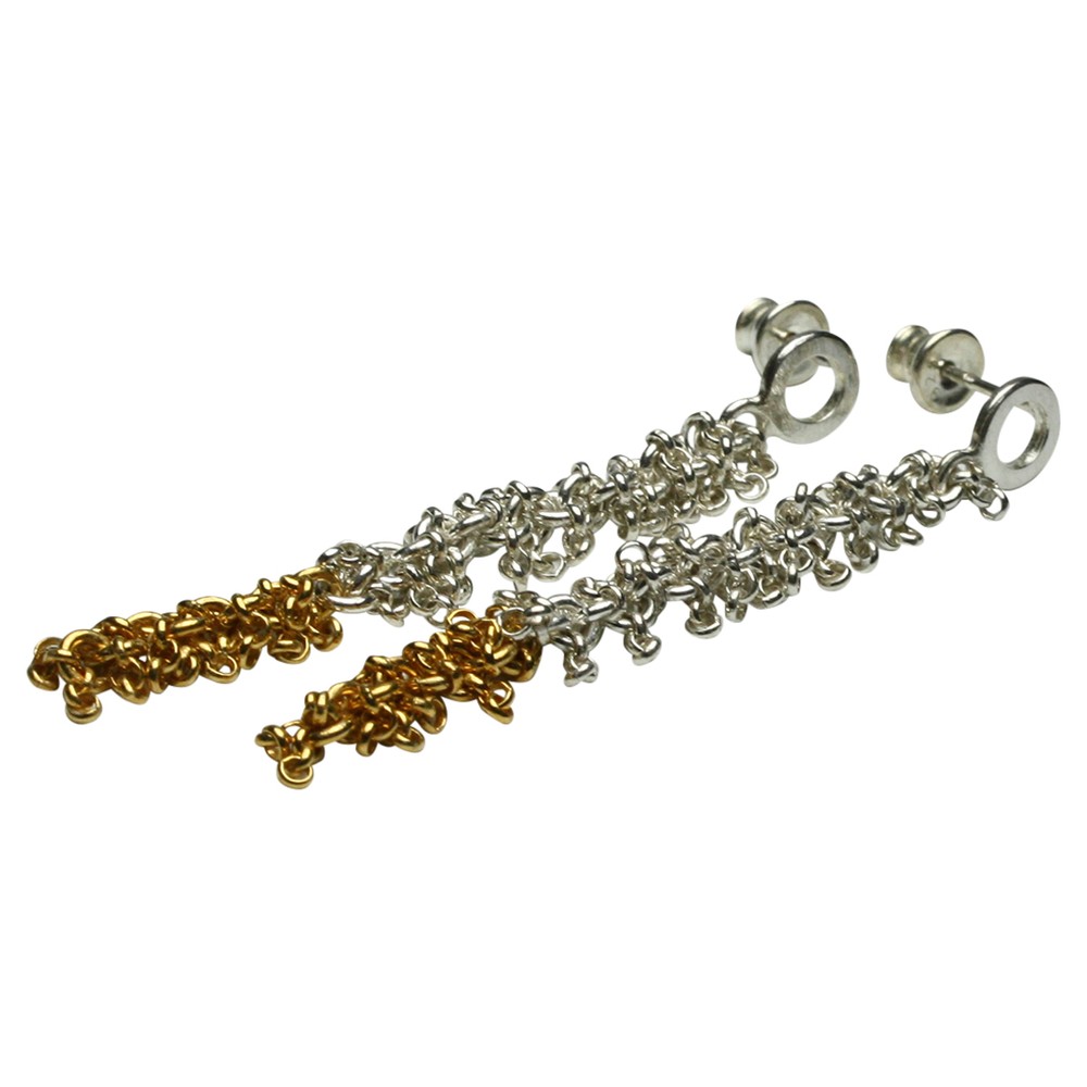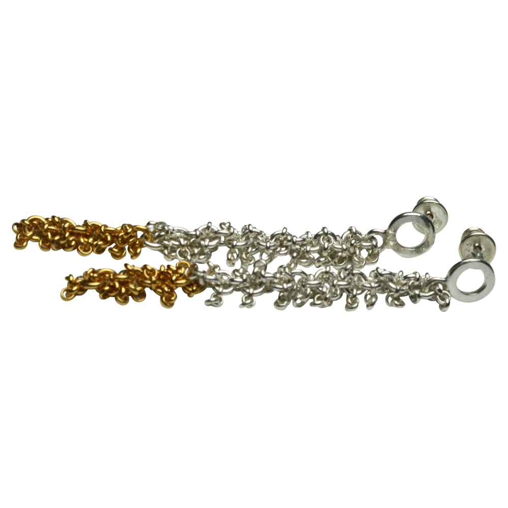 Ein Paar handgearbeitete Ohrstecker sind aus poliertem 925er Silber und zu einem kleineren Teil zusätzlich hochwertig vergoldet. Die aus vielen kleinen Gliedern gearbeiteten und voll beweglichen Ohrstecker haben eine Länge von 64 mm und einen Durchmesser von 6 mm. Die Ohrstecker wurden von der Bremer Goldschmiede Icke (Bremen Schnoor) gearbeitet und werden nun wegen altersbedinger Geschäftsaufgabe zu einem sehr viel günstigeren Preis online angeboten.