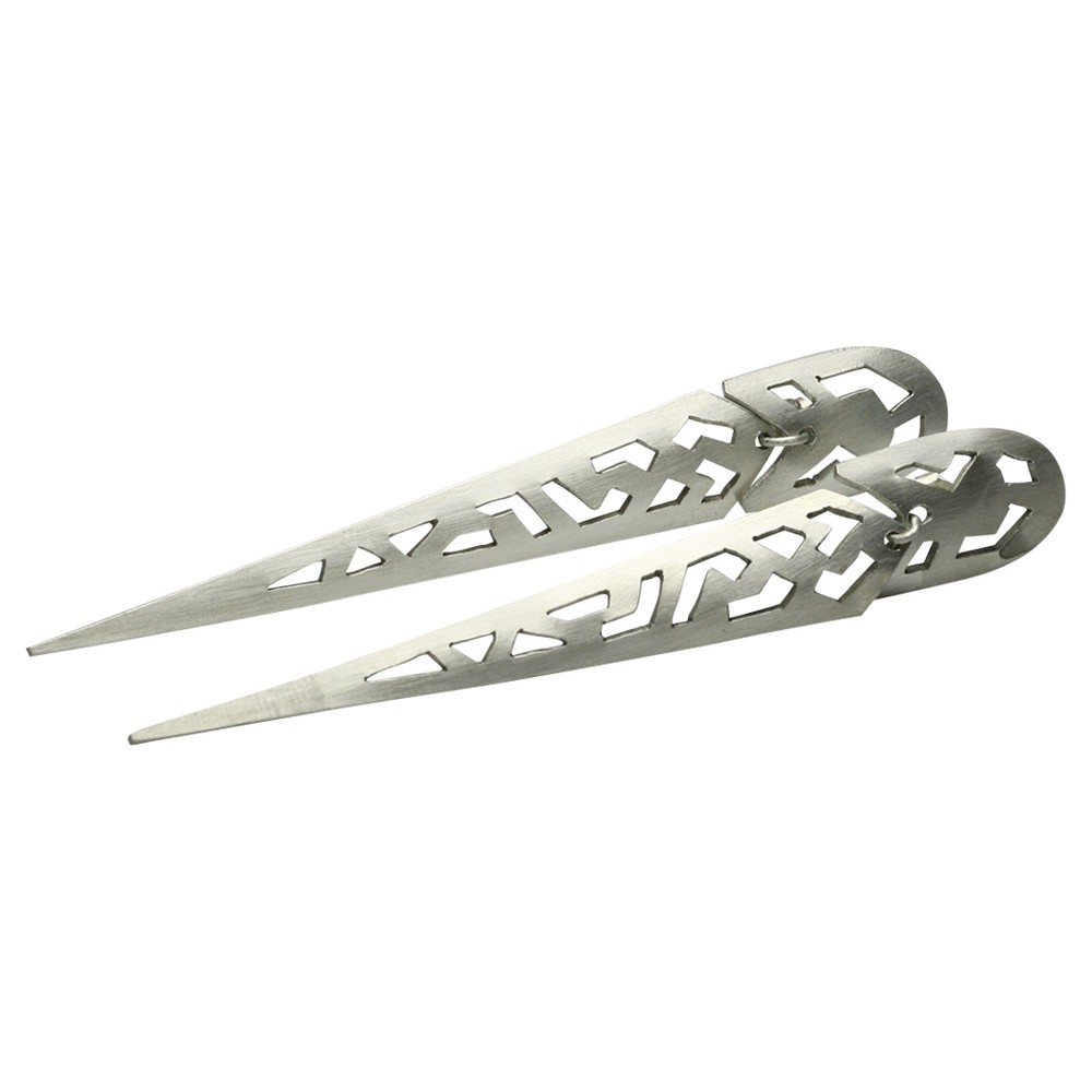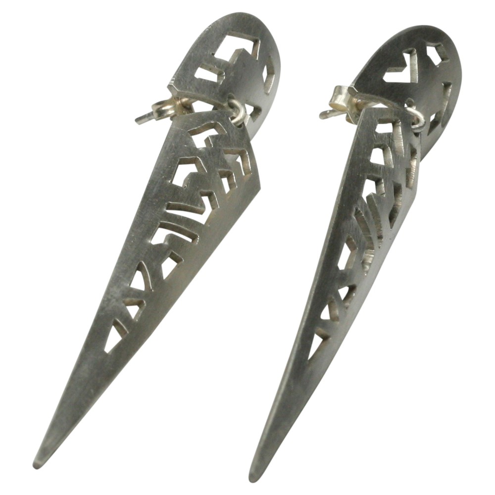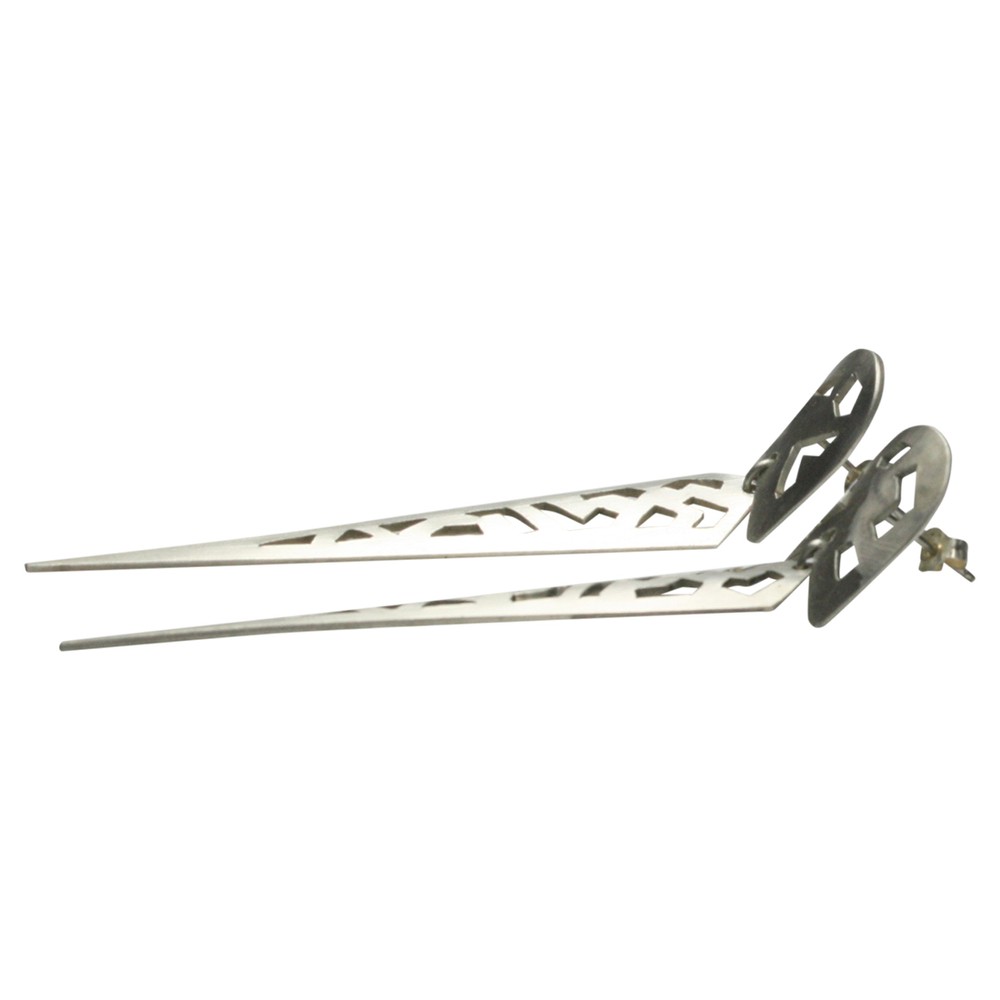 Ein Paar handgearbeitete Ohrstecker aus mattiertem 925er Silber in einem sehr besonderen Design (Unikate). Die großen 87 mm langen beweglichen und nach unten spitz zulaufenden Ohrstecker haben oben eine Breite von 12 mm und verjüngen sich unten auf 1,2 mm. Die Ohrstecker wurden von der Bremer Goldschmiede Icke (Bremen Schnoor) gearbeitet und werden nun wegen altersbedinger Geschäftsaufgabe zu einem sehr viel günstigeren Preis online angeboten.