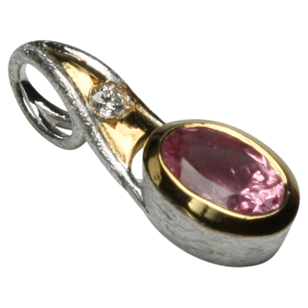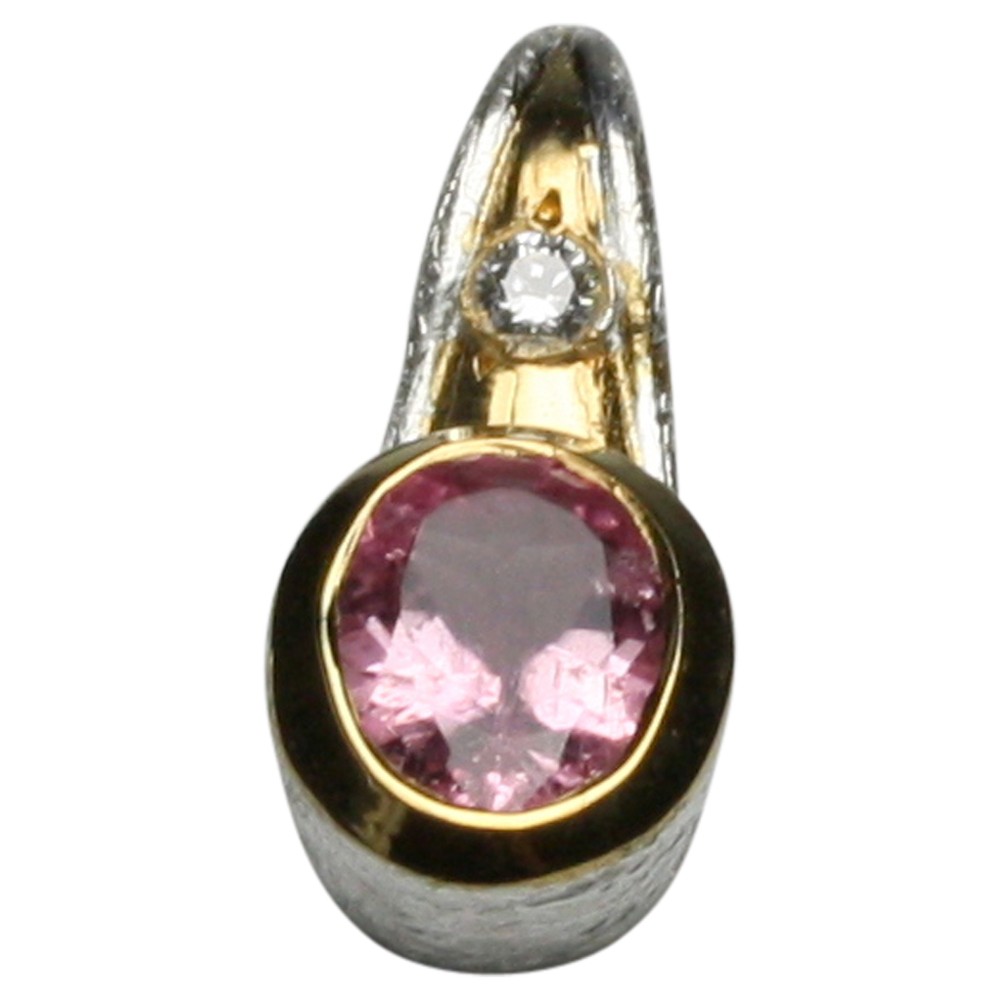 Ein feiner besonderer Anhänger aus gebürstetem 925er Silber, besetzt mit einem ausdruchstarken brasilianischen pinkfarbenen Turmalin und einem keinen Diamanten (Lab Grown). Der Anhänger hat eine Breite von 6,5mm und eine Länge von 19mm (inkl. der Öse). Die Fassung um den Stein herum, sowie das Silber um den Diamanten herum ist hochwertig vergoldet