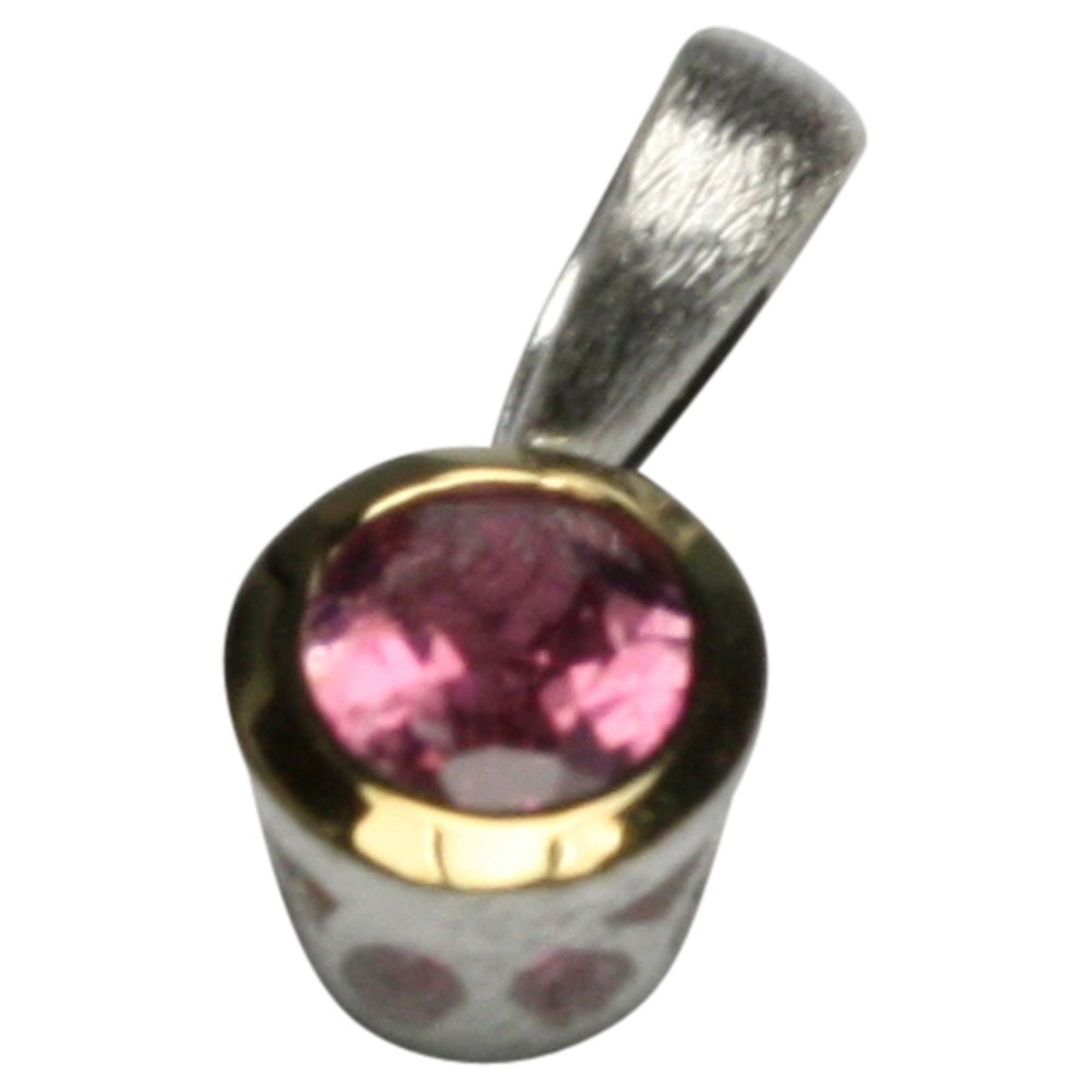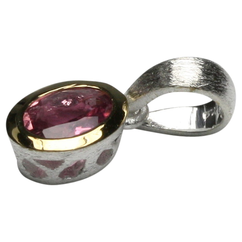 Ein besonders gearbeiteter feiner Anhänger aus gebürstetem 925 Silber, besetzt mit einem strahlenden pinkfarbenen facettierten Turmalin, Der ovale und um den Stein herum hochwertig vergoldete Anhänger mit seiner interessant gesägten Umrandung hat eine Breite von 7mm und eine Länge von 18mm inkl. der Öse.