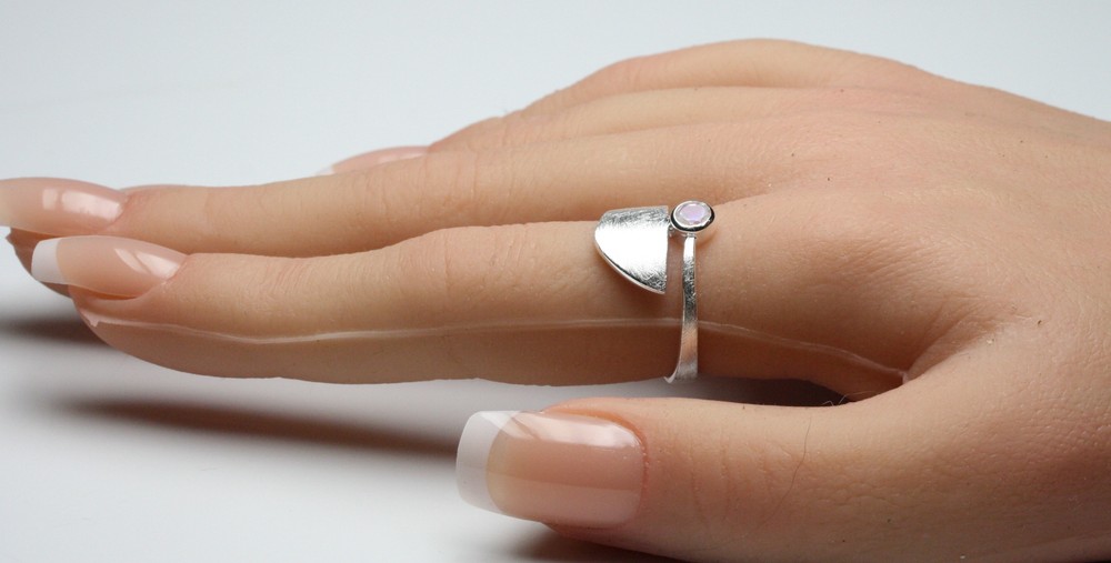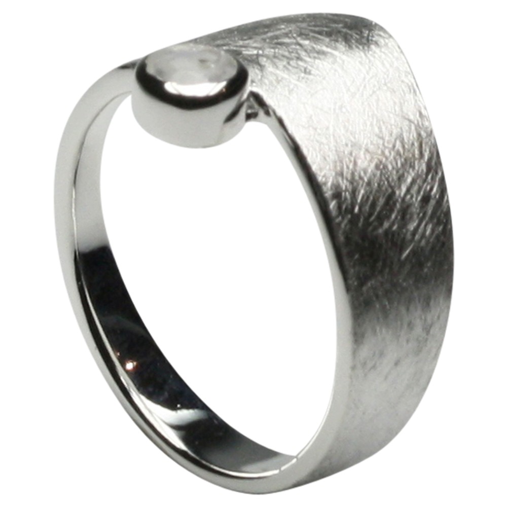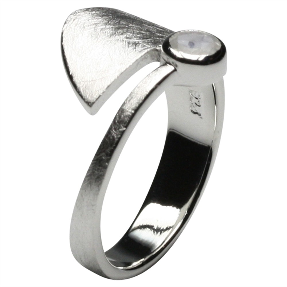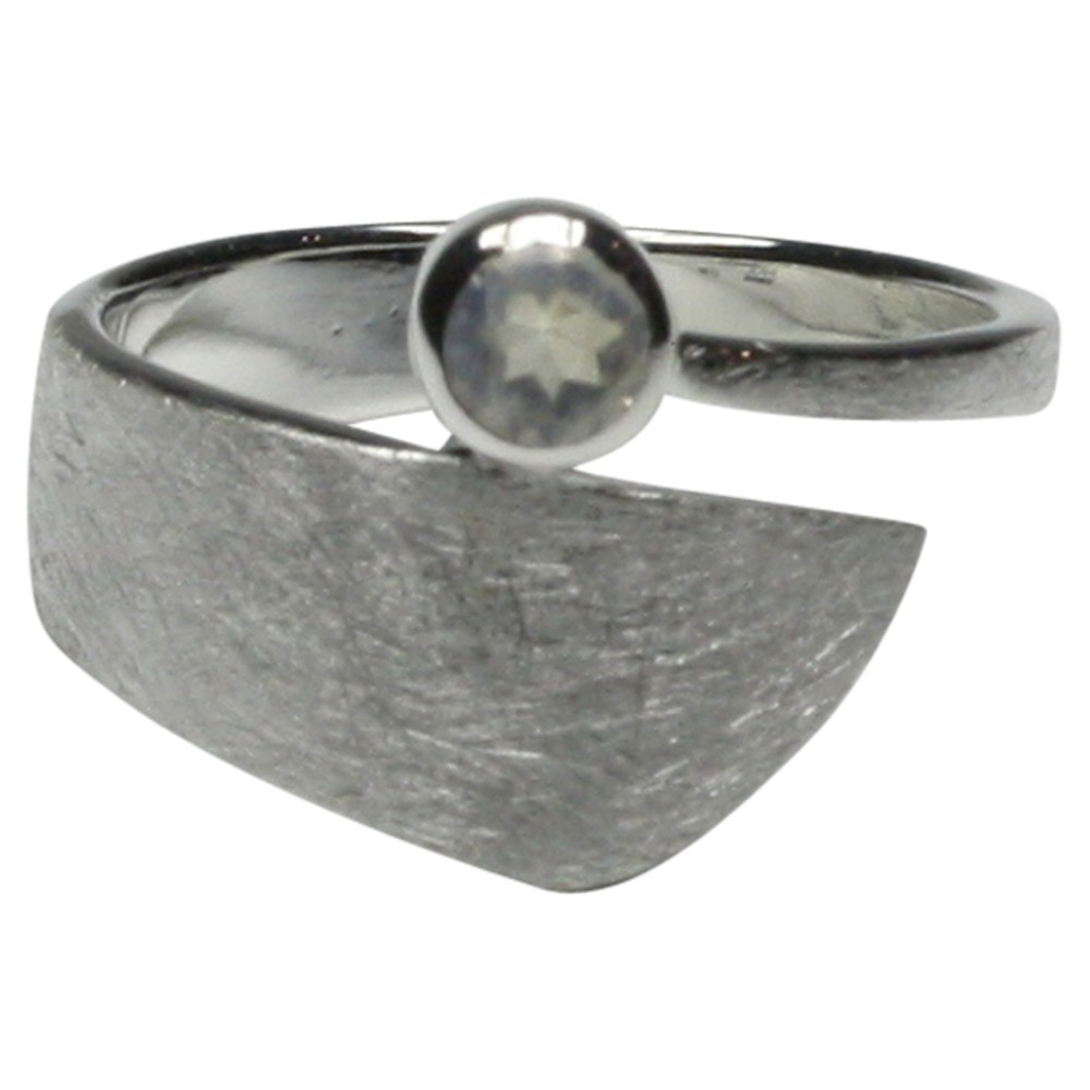 Ein eleganter Ring aus gebürstetem 925er Silber, besetzt mit einem kleinen runden facettierten Mondstein, Der Ring ist oben am Kopf 13mm breit und verjüngt sich nach unten aus 3,3mm. Der Stein hat einen Durchmesser von 5,5mm inkl. der Fassung.