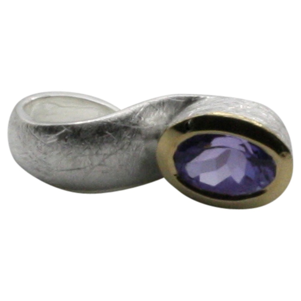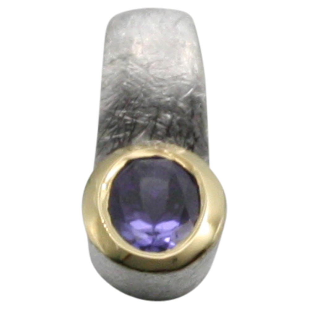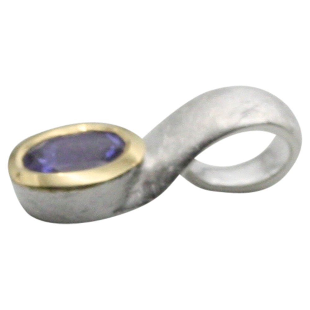 Ein eleganter Anhänger aus gebürsteten 925er Silber, besetzt mit einem strahlenen facettierten Tansanit. Die Fassung um den ovalen Stein ist hochwertig vergoldet. Der Anhänger hat eine Breite von 6,2mm und eine Länge von 18mm, die Öse hat einen Durchmesser von 4mm.